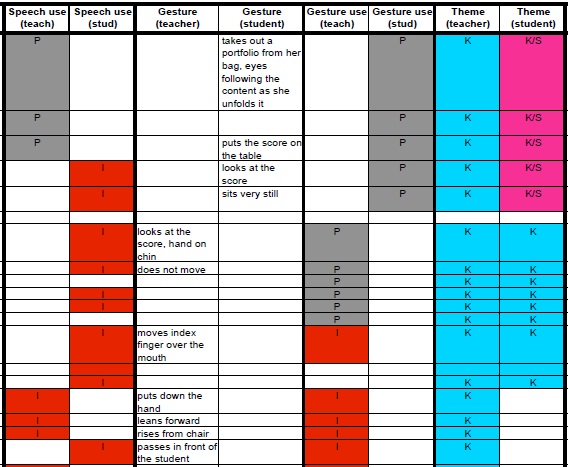 An Excel spreadsheet was programmed to contain connected fields for transcribing and coding separate modes of interaction. It is designed to facilitate the recognition of patterns in the interaction by assigning a color to each of the analytical concepts used for coding each utterance. The possibility of viewing different modes next to each other gave an overview that could graphically reveal patterns in the interaction. The Excel sheet was programmed so that it could calculate the time code format with hours, minutes, seconds, and frames. The complex transcript and coding chart was programmed to display combinations of fields needed for different tasks while hiding other fields, using keyboard commandos to switch between different views. Short commands were also used to speed up the coding process.