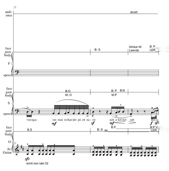 Excerpt from score representing three boys’ interpretation of the 1st book of Moses Chap. 6. The participants’ (three boys F, S, O and audience [teacher and classmates]) actions are represented in different staves as parts. The boy, O, who plays the guitar, has in addition to a stave for the guitar, a stave where his body position, direc-tion of gaze and facial expression is notated. Abbreviations or words describe the type of action (e.g., B.S means gaze at S, skratt is Swedish for “laugh”, ler means “smiles”). The other two boys’ speech is notated in music; the pitch is represented approximately. Their bodily movements, like the guitarist, are notated in separate staves. The sound of the audience is represented in an additional stave. The audience were not video recorded, therefore only the sound is given.