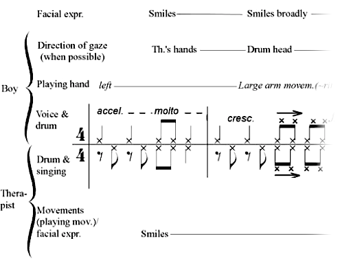 It is surprising how few authors looking at interaction in a musical context attempt to represent the musical sounds produced. When they do, one approach is to use musical notation to locate activity on a musical timeline, for example Figure 1 (Holck, 2007).