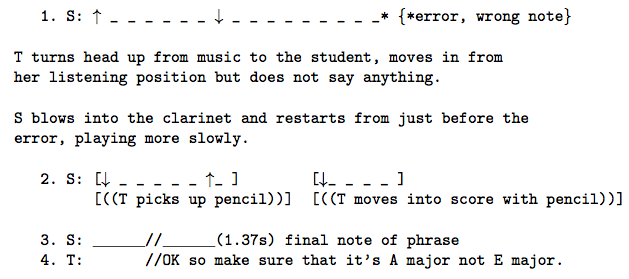 Video footage from a one-to-one clarinet lesson was analysed and coded by hand using ELAN (Brugman, 2004). Transcripts were then exported into Microsoft Word for final formatting and inclusion of specific symbols. Translating these transcripts into LaTex for publication has been a challenge since many of the symbols come from different packages and these have to function inside a verbatim environment to allow for control over line and word spacing.